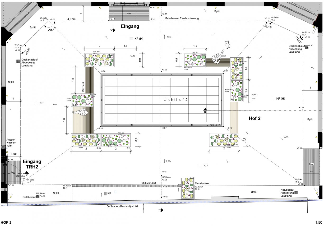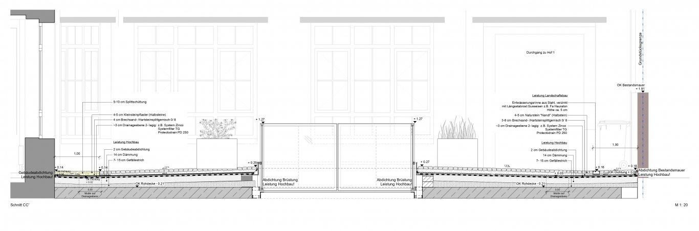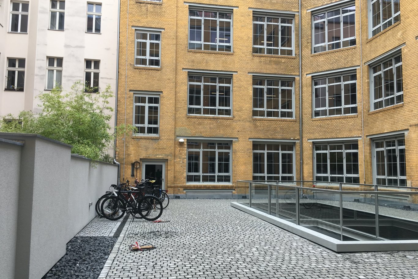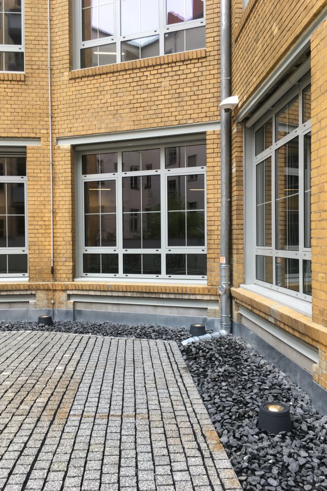 Der gesamte Gebäudeblock zwischen Teutoburger Platz und Schwedter Straße im Berliner Stadtbezirk Prenzlauer Berg ist als Ensemble geschützt. Das entsprechend der typischen Berliner Nutzungsmischung im Innenbereich des Blockes liegende Industriegebäude einer ehemaligen Schuhfabrik wurde als Bürogebäude umgenutzt. Eine großzügige Treppenanlage führt in Hof 1 in das nun ausgebaute Untergeschoss. In Mitten von Hof 2 dient ein geräumiger Lichthof als Terrasse und der Belichtung der im Untergeschoss befindlichen Räume. Die Höfe wurden mit Granitpflaster neu befestigt. Eine Traufe aus grobem Splitt umrahmt die Natursteinpflasterfläche und nimmt die Fassadenbeleuchtung auf. Pflanzgefäße und Sitzobjekte schaffen Atmosphäre und dienen dem Pausenaufenthalt (Umsetzung noch nicht erfolgt).