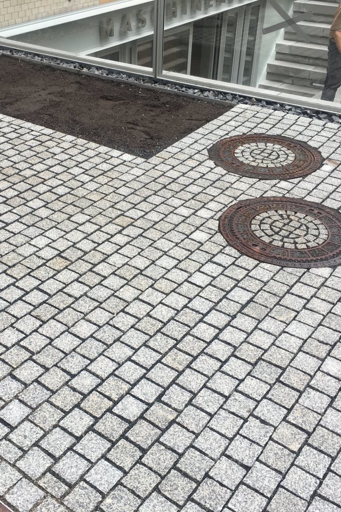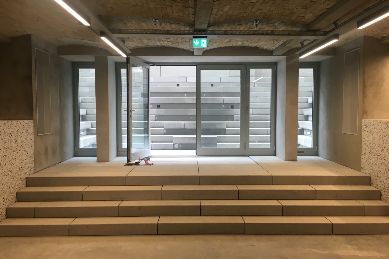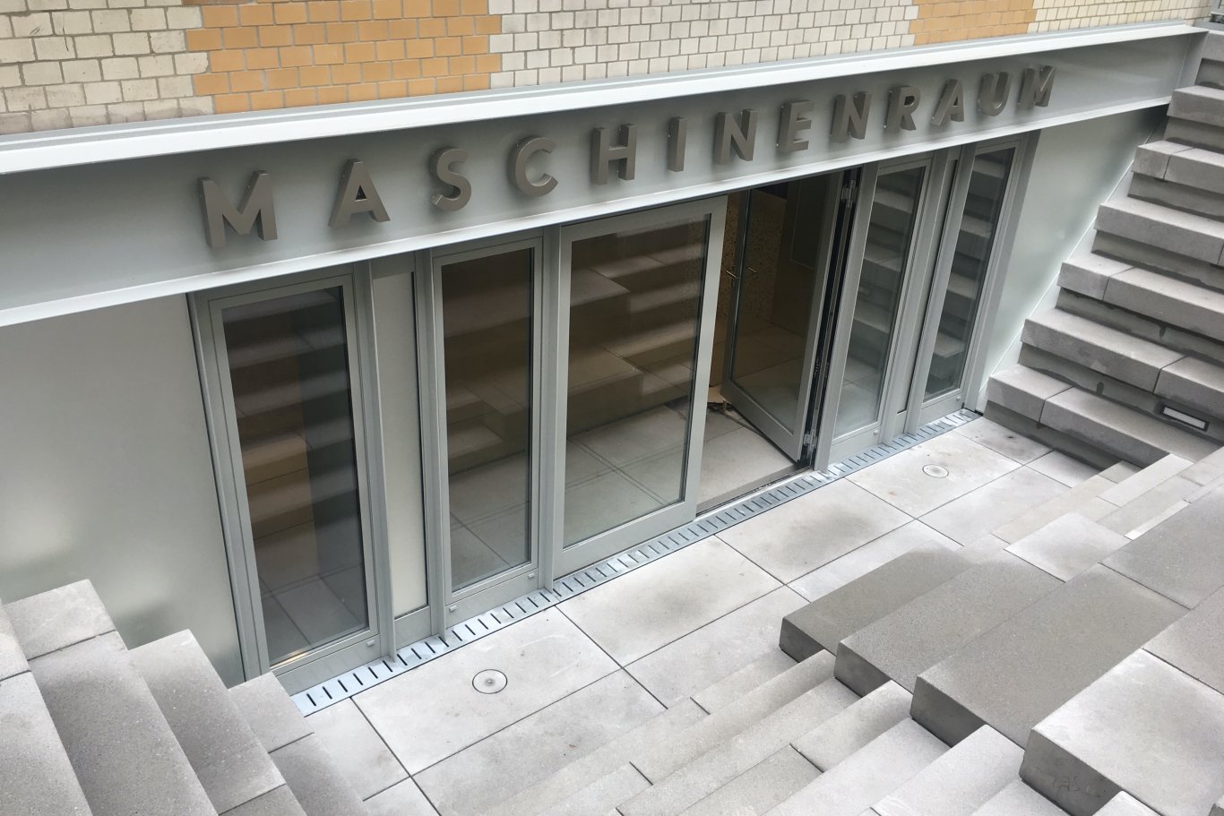 Der gesamte Gebäudeblock zwischen Teutoburger Platz und Schwedter Straße im Berliner Stadtbezirk Prenzlauer Berg ist als Ensemble geschützt. Das entsprechend der typischen Berliner Nutzungsmischung im Innenbereich des Blockes liegende Industriegebäude einer ehemaligen Schuhfabrik wurde als Bürogebäude umgenutzt. Eine großzügige Treppenanlage führt in Hof 1 in das nun ausgebaute Untergeschoss. In Mitten von Hof 2 dient ein geräumiger Lichthof als Terrasse und der Belichtung der im Untergeschoss befindlichen Räume. Die Höfe wurden mit Granitpflaster neu befestigt. Eine Traufe aus grobem Splitt umrahmt die Natursteinpflasterfläche und nimmt die Fassadenbeleuchtung auf. Pflanzgefäße und Sitzobjekte schaffen Atmosphäre und dienen dem Pausenaufenthalt (Umsetzung noch nicht erfolgt).