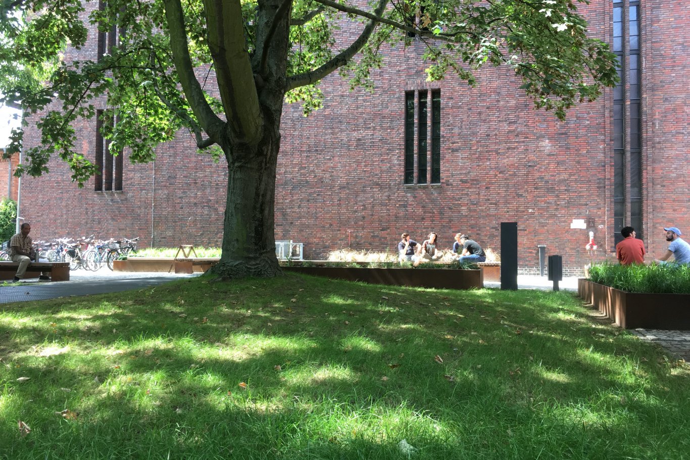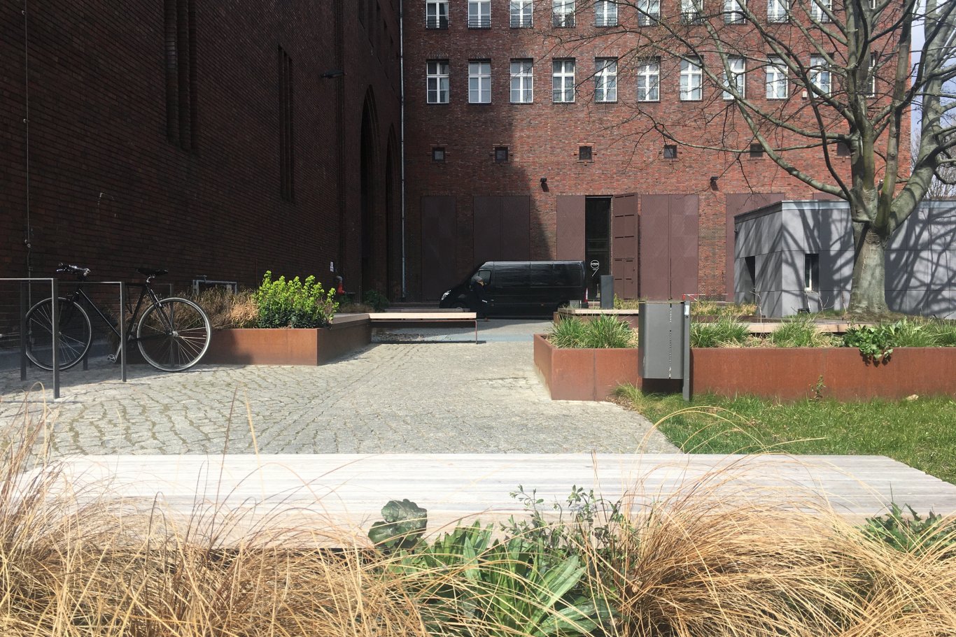 Das Bewahren des bauzeitlichen Charakters der Freianlagen um die markanten Baukörper des Gebäudeensembles war zentrales Anliegen des Freiflächenentwurfs. Notwendige Einbauten wurden ergänzt und neue Aufenthaltsbereiche für die Nutzer geschaffen. Sitzgelegenheiten und Pflanzbeeten fügen sich vor dem Hauptgebäude in ihrer Geometrie in das vorhandene orthogonale System ein. Die Verwendung von rostendem Stahl erinnert an die industrielle Geschichte des Ortes.