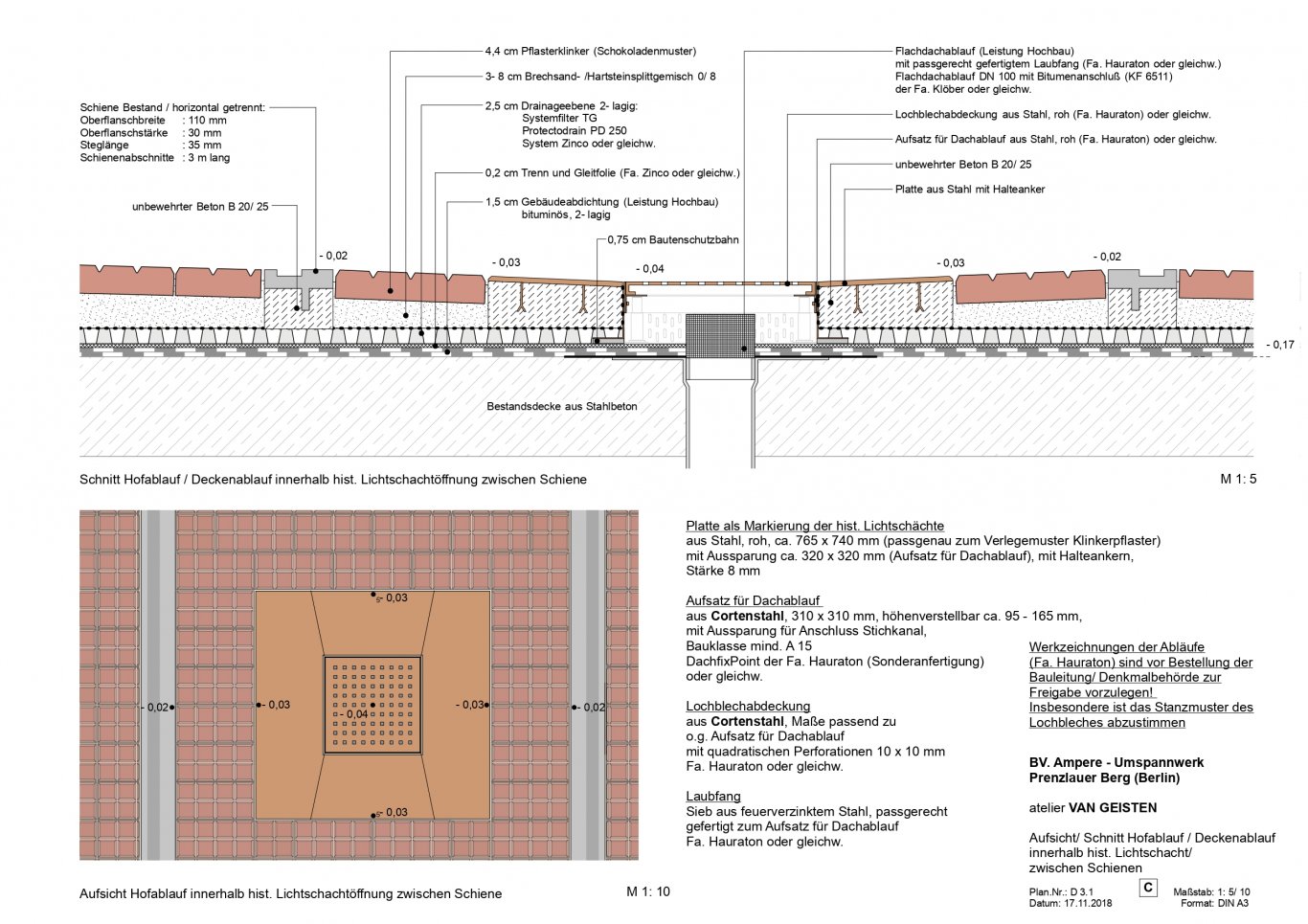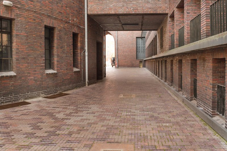 Die bautechnisch anspruchsvolle Wiederherstellung der Hofpflasterdecke um den elliptischen Baukörper der historischen Leitwarte erfolgte in enger Abstimmung mit dem Denkmalamt. Die alten Industrieklinker mussten zur Abdichtung der darunter liegenden Kellerdecke zunächst vollständig entfernt werden. Auf Grund von Materialverlusten wurden eigens gefertigte Klinker bei der Wiederverlegung beigemischt. Zur Bereinigung von bauzeitlichen Mängeln musste das Oberflächengefälle neu angelegt und zahlreiche Abläufe neu geschaffen werden. Die aus Cortenstahl gefertigten Sonderbauteile wurden im Raster der im Hof ursprünglich vorhandenen Lichtschächte angeordnet, so dass sie sich in das historische Bild einfügen.