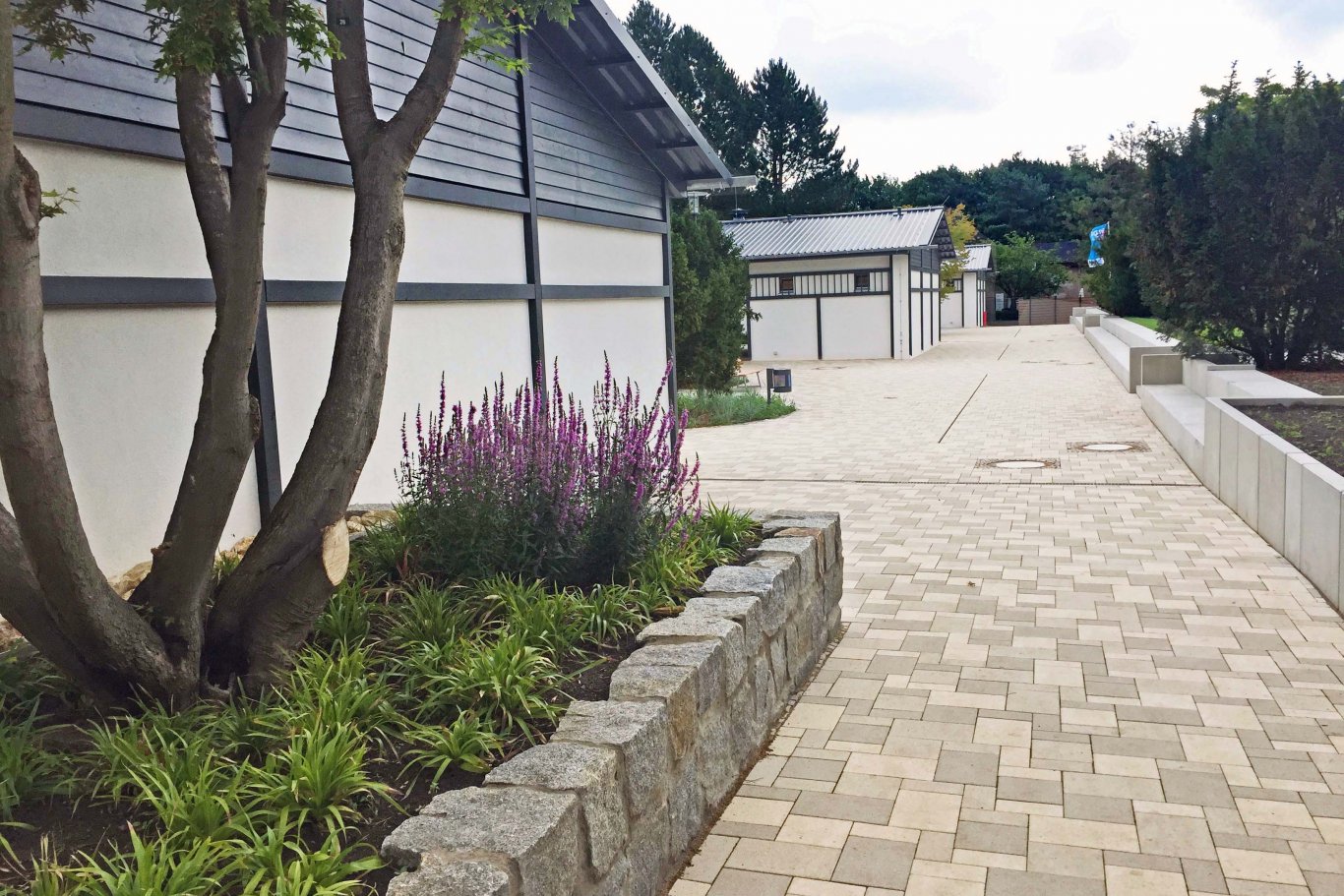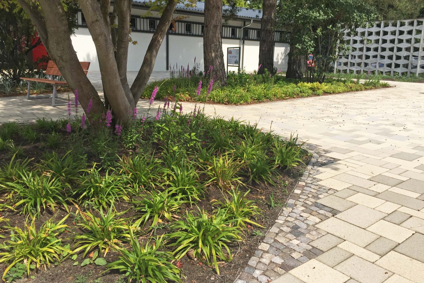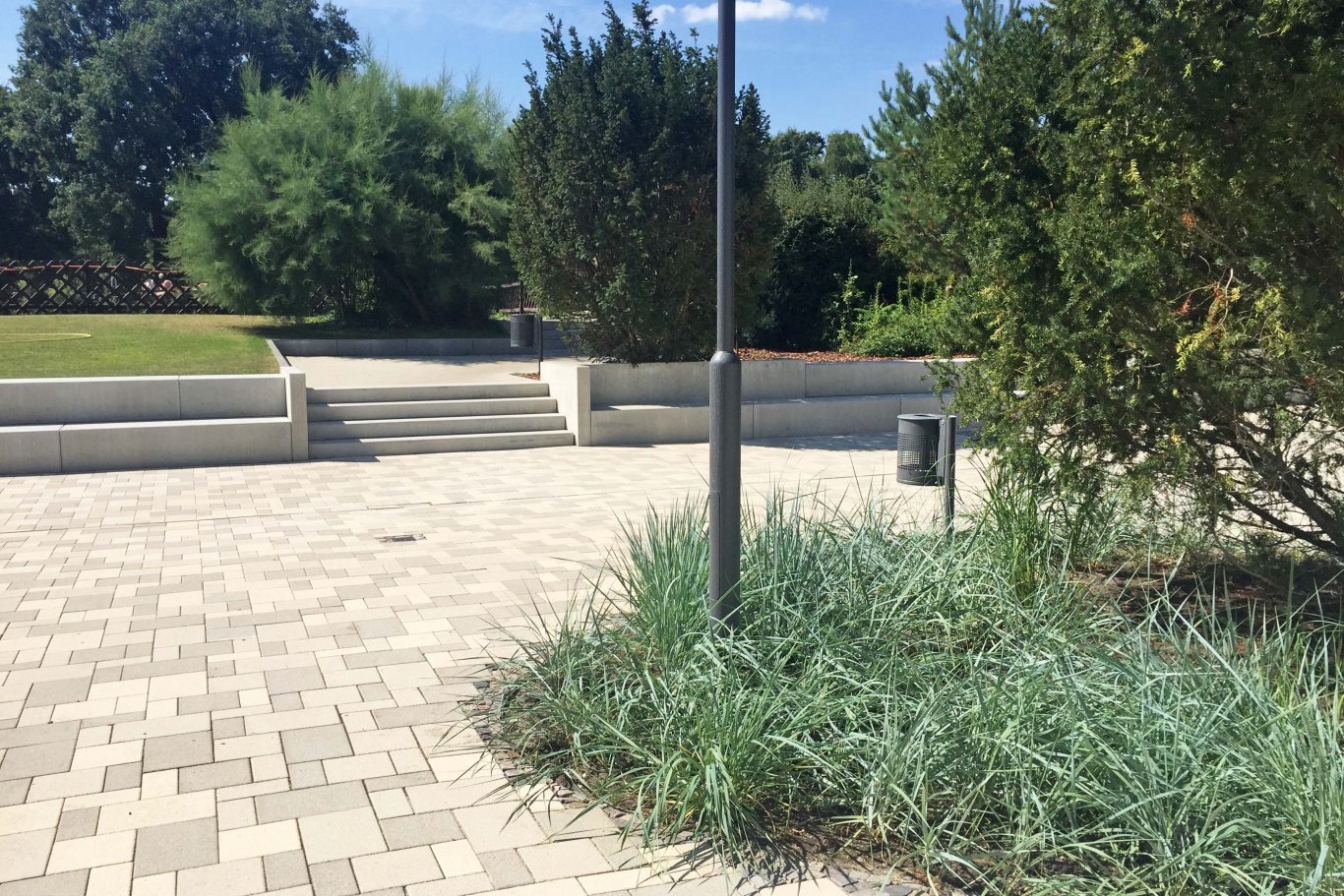 Im Rahmen der Neugestaltung des Freibades Kiebitzberge wurden die Freiflächen zwischen den Funktionsgebäuden, eine Promenade und der Saunagarten neu gestaltet. Im Die bestehenden Bäume und Sträucher wurden weitestgehend erhalten und als Solitäre mit begleitenden Unterpflanzungen in die neuen Pflaster- und Wegeflächen integriert. Bezugnehmend auf den vorhandenen Baumbestand und den japanisch inspirierten Ausdruck der Funktionsgebäude wurden für die Unterpflanzungen überwiegend Gräser gewählt. Seitlich angeordnete Sitzstufen verleihen den großzügigen Erschließungsflächen der Promenade zusätzliche Aufenthaltsqualität. Der helle, in drei Farbabstufungen verlegte Betonstein unterstreicht den schlichten und sommerlichen Charackter der Anlage.