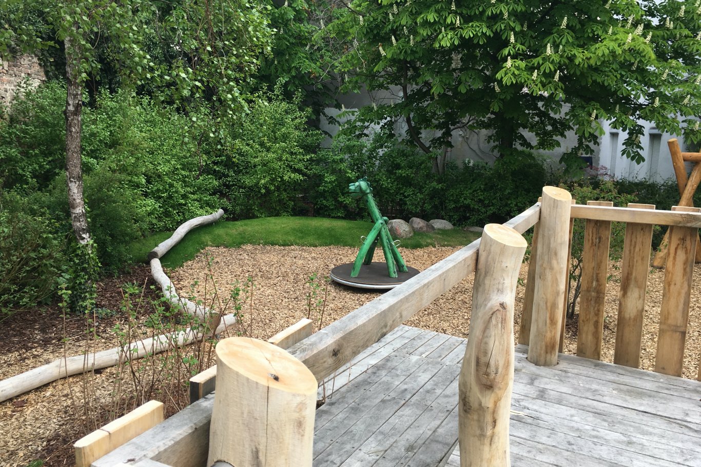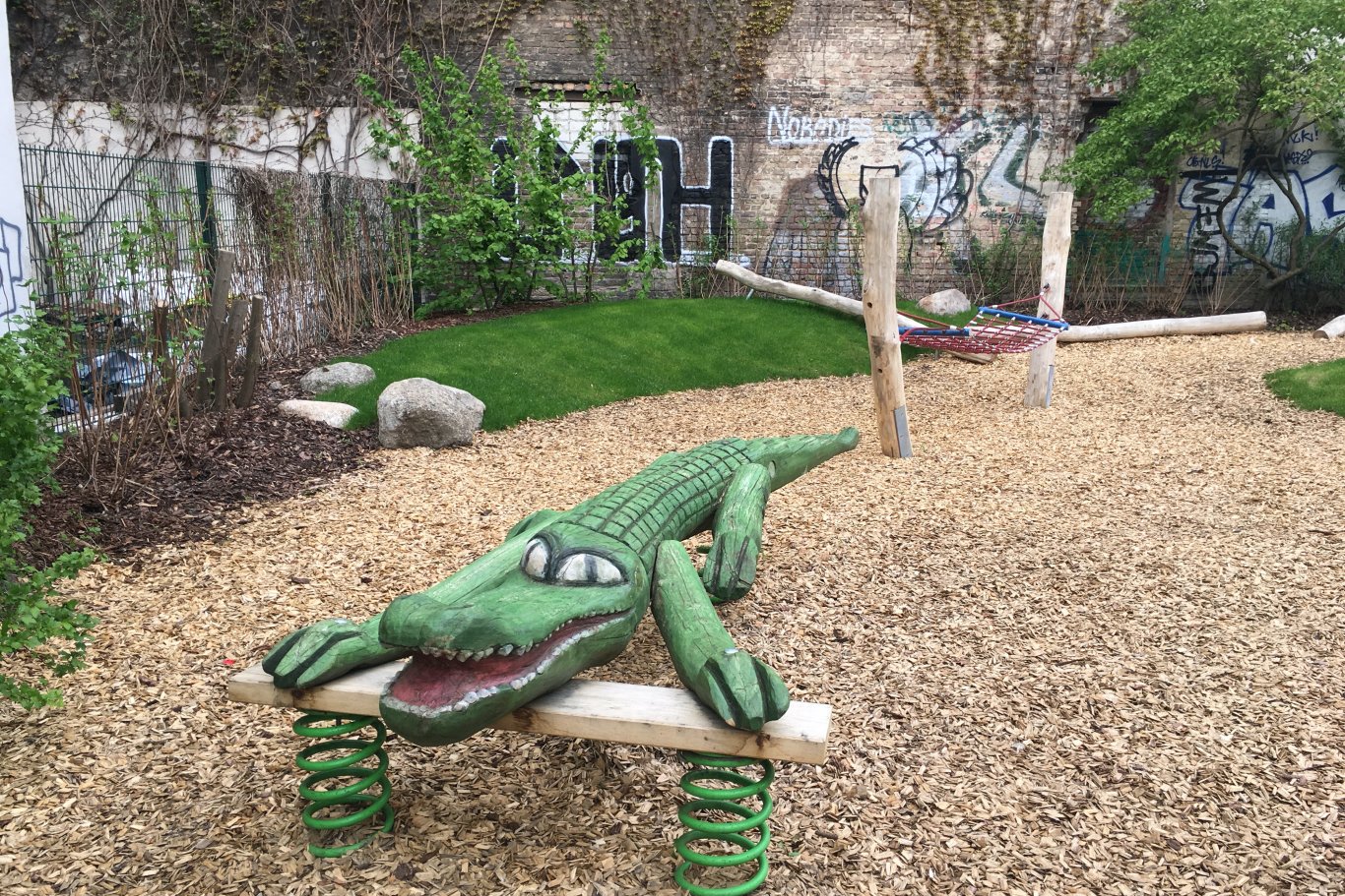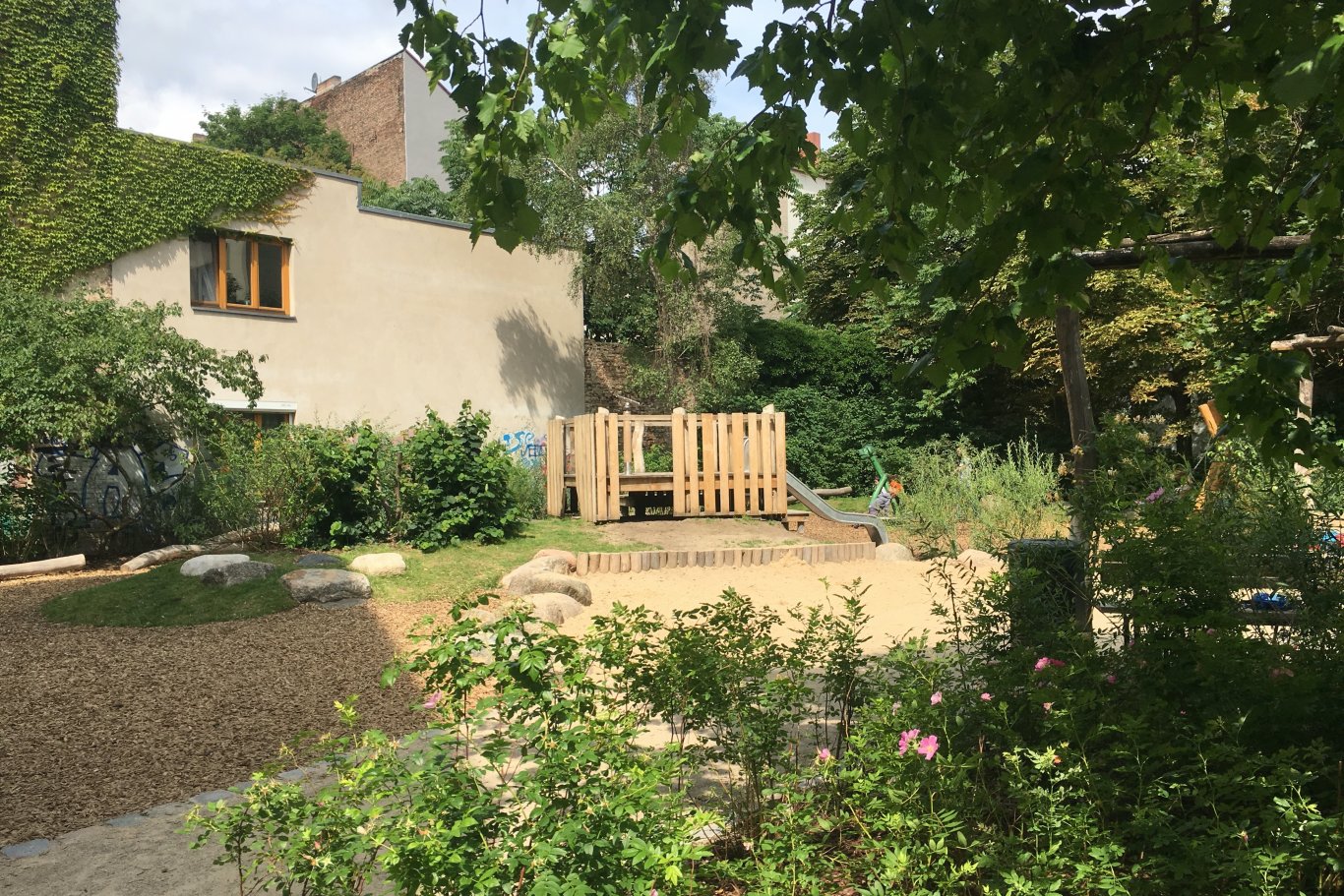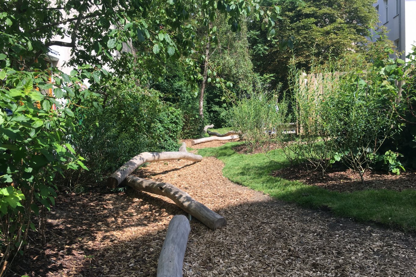 Der bestehende Spielplatz Ackerstraße, der auf der Grundlage eines gewonnenen Wettbewerbes neu beplant wurde, erstreckt sich in die Tiefe eines gründerzeitlichen Quartiers in Berlin-Mitte. Kinder lieben Abenteuer und so diente das Motiv des Flussdeltas mit großen Steinen und einer reichen Flora und Fauna als Inspiration. Die bereits in die Jahre gekommenen, vorhanden Tierfiguren wurden erhalten und überarbeitet und führen die Kinder entlang des neu angelegten Weges zum eigentlichen Spielbereich. Hier weitet sich das Grundstück auf und bietet den Kindern mit einer erhöhten Aussichtsplattform, Balancier -und Schaukelmöglichkeiten sowie versteckten kleinen Wegen zahlreiche Möglichkeiten des naturnahen Spiels.