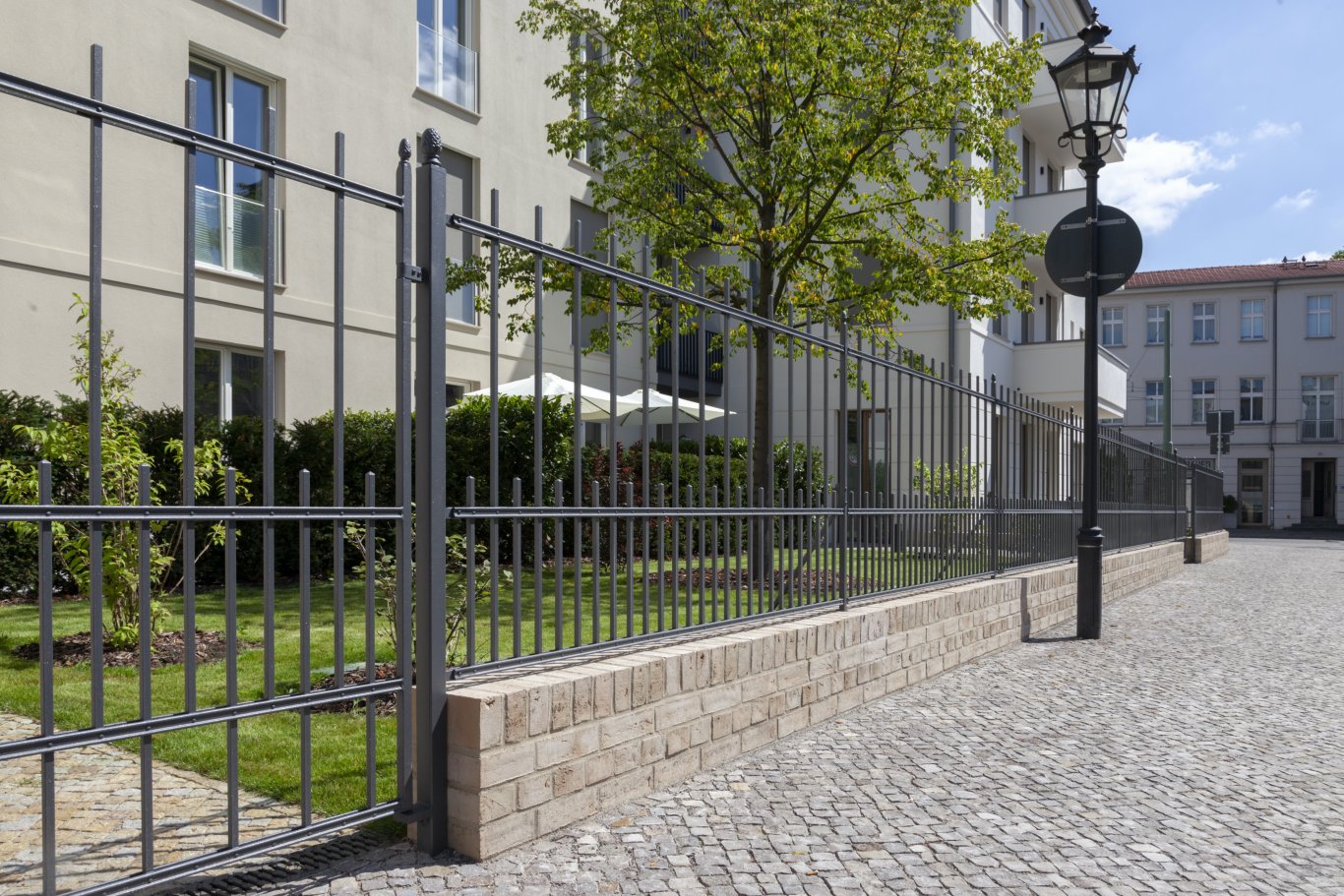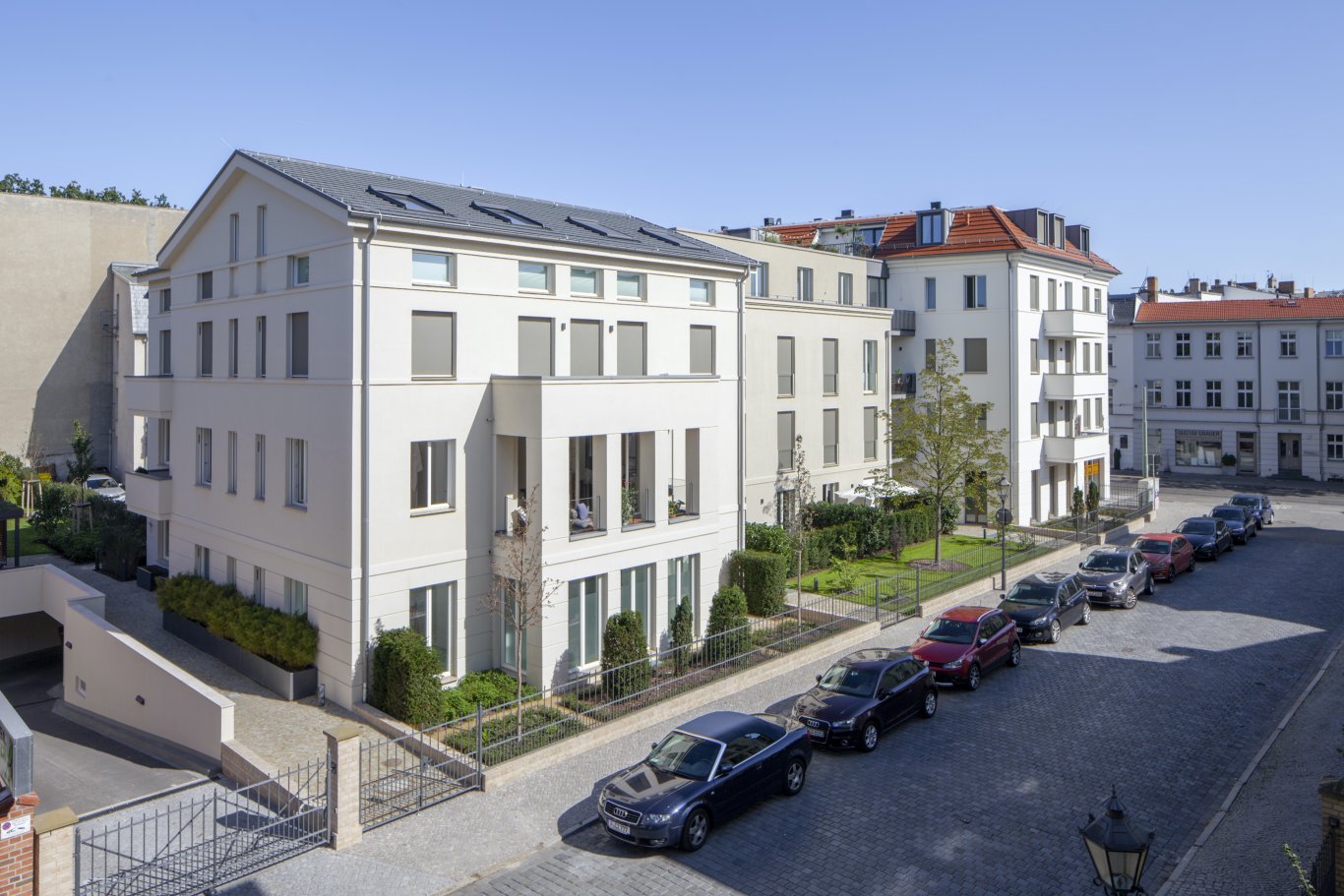 Die Helene-Lange-Straße ist durch eine, weitreichend noch gut erhaltene und für die Entstehungszeit im 19.Jh typische, bürgerliche Vorgartenzone geprägt. Die villenartige Baustruktur wurde im Neubau des Mehrfamilienhauses fortgeführt. Die Planung greift die historischen Vorgaben bei der Ausformulierung von Strukturen und Gestaltungselementen auf und setzt sie sowohl in der Material-als auch Pflanzenauswahl um. Der für die Nutzung als Wohngebäude notwendige Müllstandort und ein Kinderspielplatz wurden im rückwärtigen Teil des Gebäudes integriert.